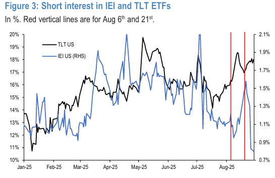 One way to gauge positioning is via short interest in major bond ETFs. Figure 3 shows IEI (3–7y USTs) and TLT (20y+ USTs). Since early August—and particularly after August 21—short interest in IEI has declined relative to TLT, indicating an increase in steepener positions, consistent with the Fed independence trade.