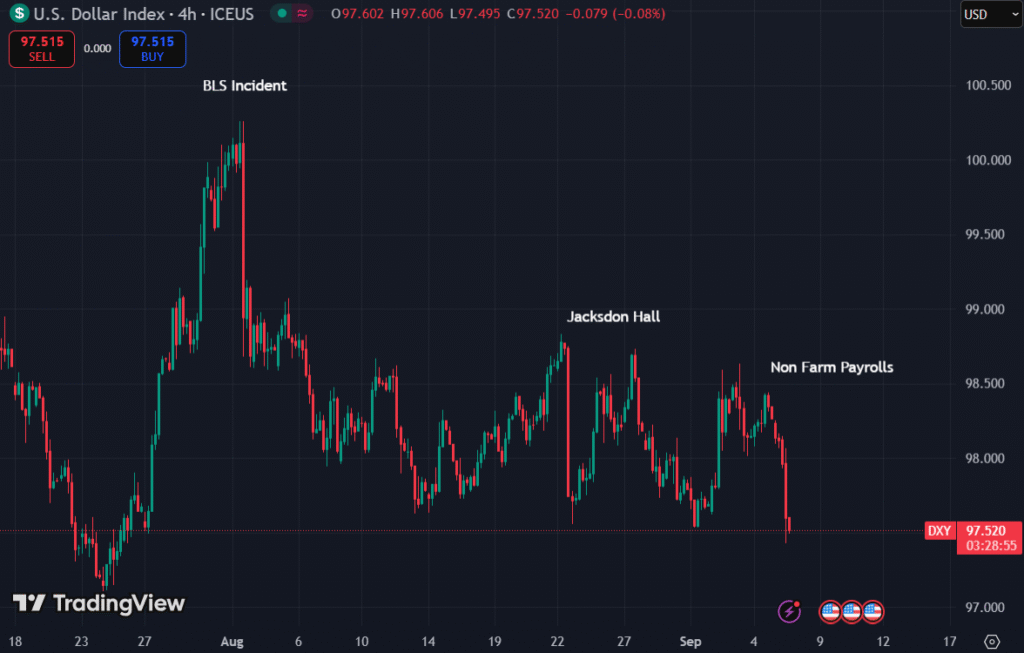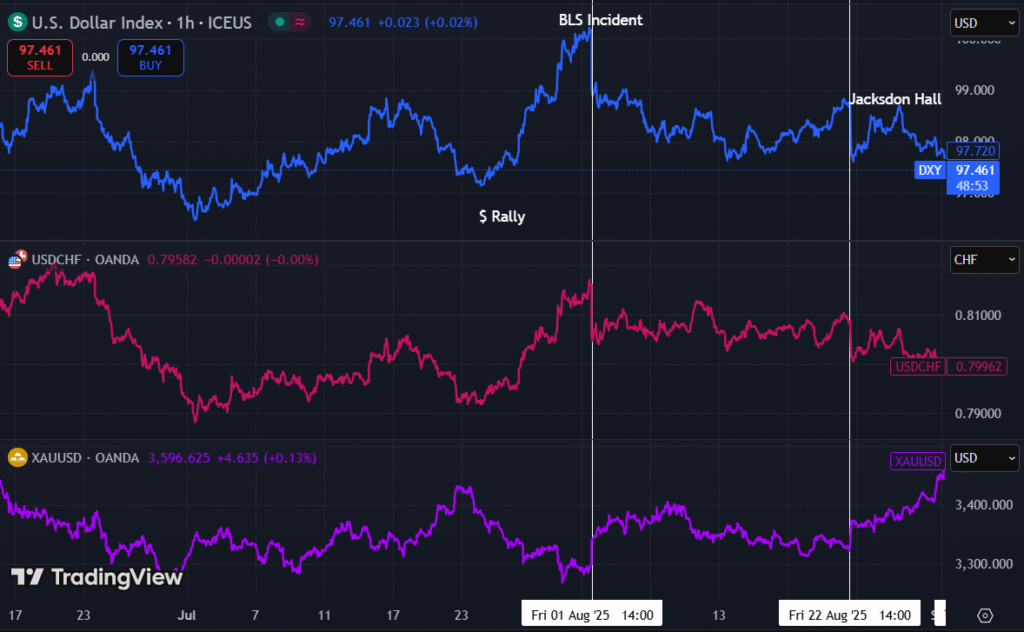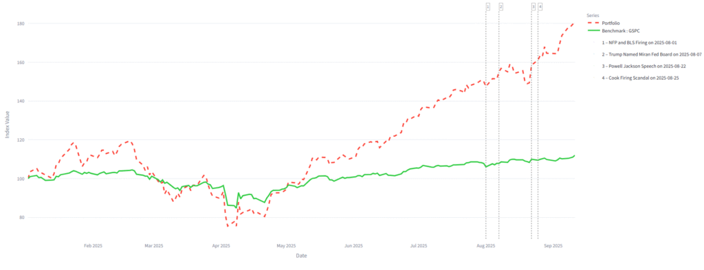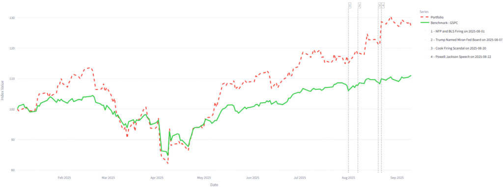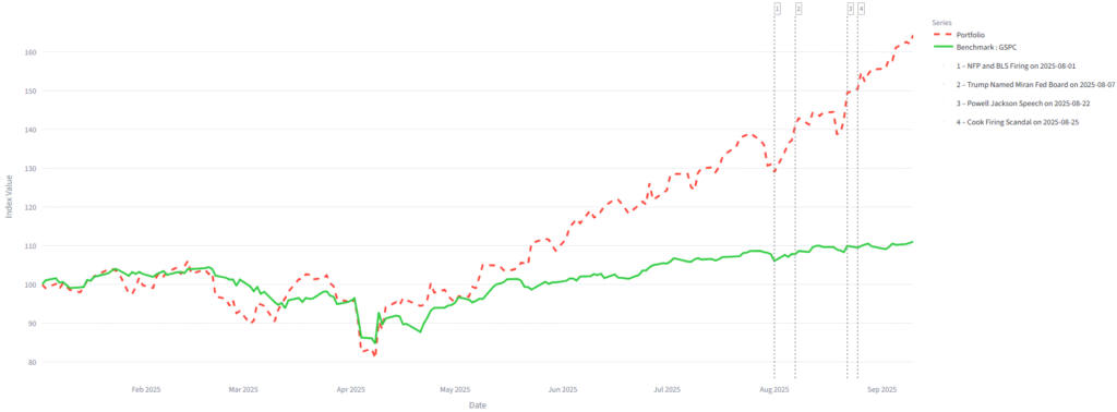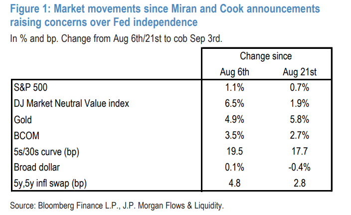 The Fed independence trade has been shaped by rising tensions between Powell and Trump since the start of the year. Pressure intensified in August, beginning with the August 7 announcement that Trump would nominate Miran to complete Governor Kugler’s term, followed by the August 22 report that President Trump would dismiss Fed Governor Cook unless she resigned. These developments have amplified concerns among economists and market participants about Fed independence.