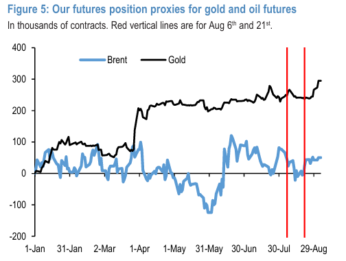 This figure shows futures positioning proxies for gold and Brent. It highlights a sharp increase in long gold futures positions following reports of Governor Lisa Cook’s potential removal.