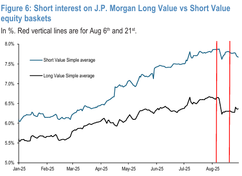 Figure 6 (Short interest on J.P. Morgan Long Value vs. Short Value equity baskets) suggests that year-to-date, the gap between the two short-interest ratios has widened, with short interest on Short baskets rising relative to Long baskets starting as early as April. This gap experienced a sharp, discontinuous widening in the aftermath of the Miran announcement, consistent with the “Fed independence trade” manifesting through an investor shift toward value stocks.