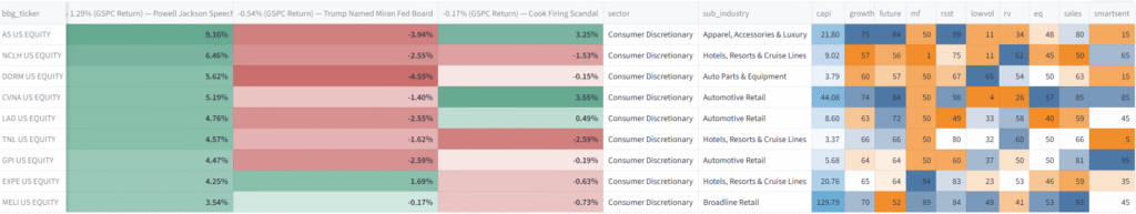 The Fed Independence Trade is twofold. On one hand, it is a rate-cuts trade: discretionaries, financials and certain real estate industries (such as homebuilders) stand to benefit from lower rates, while growth stocks in technology would also gain as future cash flow are discounted at a lower rate.