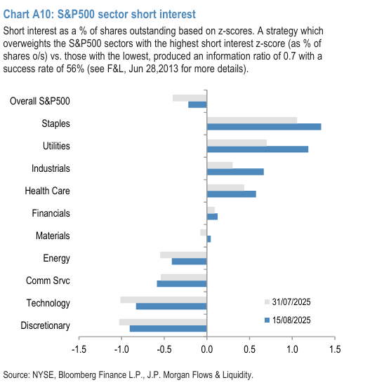 The value rotation was a key manifestation of the inflation trade in equities during 2021, and the implications of a “Fed independence trade” for equities should be broadly similar. The difference is that under the Fed independence trade, growth stocks may also benefit from rate cuts, particularly in areas such as technology and AI, which represent a broader structural shift. In addition, certain sectors such as discretionary could benefit from lower rates, meaning that both value-oriented discretionary stocks and growth-oriented tech stocks can perform well in this environment. as you can see with the sorted short interest graph below.