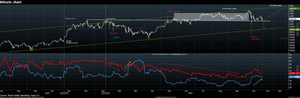 Bitcoin has made fresh all-time highs above $126k before retracing towards $107k (Figure 1). On Friday afternoon however, the US-China tariff tensions were reignited as President Trump imposed 100% additional tariff on China and export controls on critical software effective Nov 1st, in reaction to China’s stricter export controls on rare earth minerals. Bitcoin moved lower from $122k -> $117k and Ethereum from $4350 -> $4100 (Figure 1). The crypto market moves, however, extended after the US market close with one of the biggest liquidation cascades over the weekend, with almost $19.3 billion in open interest were erased (The Block). Bitcoin seeing $1.37b and ETH seeing $1.26b worth of liquidations respectively (The Block). Bitcoin briefly fell below $105k (-15% on the day) and Ethereum, at one point, went below $3.5k (-25% on the day) before settling at $111/112k and $3.7/3.8k range respectively on Saturday morning. Trade tensions were de-escalated on Sunday as China signaled softer stance with a statement from the Ministry of Commerce (MOFCOM), with key pointers being that the export controls are not a ban, compliant non-military rare earth exports will be approved, and its new rare earths policy was a reaction to the additional US restrictions instead of a proactive escalation. Additionally, softer tone then came out from the US side as well. Crypto followed with a reversal where Bitcoin traded up to $115k and Ethereum to $4100, still below the Friday close levels.
