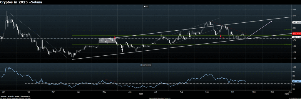 The chart of Solana below shows that the XSO Currency is rebounding from the low band of its horinzontal channel. The Breakdown level is 181, and the upside target is 195/200: